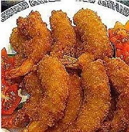 主料:大虾370克,生菜叶70克,鸡蛋2个,面粉25克,面包50克。调料 植物油500克(实耗约50克),净葱8克,姜5克,盐3克,胡椒粉1克,料酒13克,味精4克。