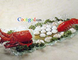 3、将鱼蓉做成的牡丹花和龙虾圆子同摆盘中即成。