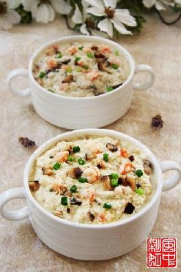 嫩豆腐1块,鲜虾仁10只,香菇6-8朵,鸡蛋2个,香葱适量,盐,料酒,香油适量