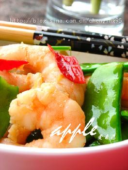 荷兰豆,虾,蒜头,姜,干辣椒(不用太多),鸡蛋,生粉,鲜贝露调味汁,盐