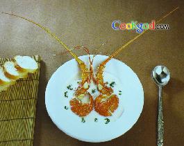 小龙虾1只,洋葱15克,蘑菇1个,面粉30克,番芫荽少许,牛奶80克,鲜奶油10克,白脱油20克,鸡汤200克,盐1/2茶匙,蔬菜香料适量。
