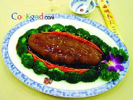 1、锅内放入上汤大火烧开后加入整只水发乌参、绍酒、鲍汁、糖、葱段、姜块、味精后改用小火煨10 分钟至透装盘。