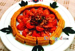 1、基围虾从脊背开刀去沙线,入开水大火焯水30秒;色拉油烧至六成热,入虾,中火炸1分钟捞出;玉米一开四半切成4厘米长的段,下六成热的油中火炸30秒。