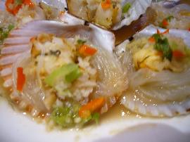 2、蒜蓉炸至金黄色。壳上放粉丝(至少泡半小时),再放扇贝肉,盖蒜蓉,加红椒和小葱点缀。加李锦记蒸鱼豉油,上蒸锅大火六分钟即可。