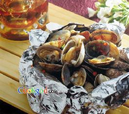 3、移入烤箱烘烤,至蛤蜊张开口时,取出食用即可。