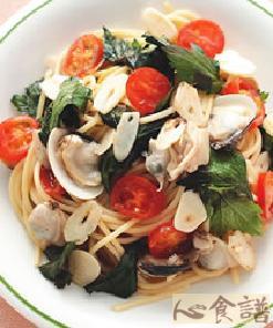 2在平底锅中倒入橄榄油,放入蒜片炒香,再放入圣女小蕃茄片续炒,加入蛤蜊和所有调味料,煮至蛤蛎打开后捞起,备用。