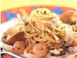 义大利面120公克,虾仁50公克,蛤蜊80公克,透抽50公克,洋葱末30公克,巴西里末1大匙,九层塔少许,义大利综合香料少许,高汤1/2杯,白酒3大匙,胡椒粉少许,盐1小匙