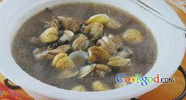 材料鸡大腿1只 大蛤蜊6个 去壳干板栗10粒,黑豆100克 姜4片 葱1根调味料A料:热水6杯B料:盐1小匙c料:黄酒2大匙