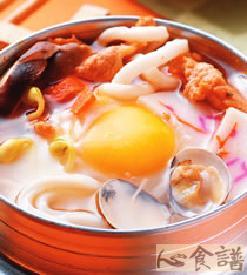 猪肉片50公克,韩国泡菜20公克,葱1根,黄豆芽10公克,蛤蜊3个,乌龙面150公克,鲜香菇1朵,鱼板3片,牛骨高汤350㏄,蛋1颗,盐1/4茶匙,酱油1/2茶匙,味醂1茶匙,米酒1/2茶匙,姜泥1茶匙,米酒1茶匙,韩国细辣椒粉1茶匙,酱油1/2茶匙,细砂糖1/4茶匙,太****1茶匙,全蛋1/2颗