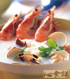 花枝30公克,香茅1小段,椰奶100c.c,南姜2片,柠檬叶1片,香菜梗少许,水1000c.c,蛤蜊4个,鲜虾3尾,香菜少许,小辣椒2支,柠檬汁1大匙,盐1小匙,鱼露2小匙,白胡椒粉少许,糖1小匙