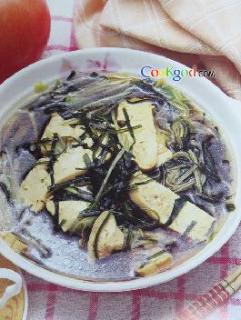 3、锅中放入植物油烧热,加入海带丝、丁香、大茴香、桂皮、花椒、豆腐片、酱油,加入高汤烧开,改中火烧至海带熟烂,豆腐入味,再放入萝卜丝焖熟,撒入精盐、味精即可。