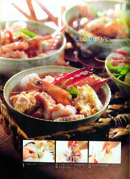 花蟹600克,八爪鱼500克,,海红300克,大虾8支,鳓鱼子100克,豆芽、萝卜各400克,水芹菜150克,鱼是鱼酱汤800克,清酒、大葱各30克,盐8克。汤水佐料辣椒面60克,辣椒酱15克,酱油30克,清水30克,蒜泥30克,姜末、盐各5克。辣根醋料辣根汁、酱油各30克,海带水、食醋各15克,柠檬汁8克,白糖5克,盐2克,凉开水10克。