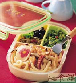 1.)先将菜洗净切好备用,再用少许油爆香洋葱丝、肉丝、香菇丝、红萝卜丝及鱼板等,略炒数下,再放入乌龙面及调味料(1)拌炒至汤汁收干立即熄火,即可盛起放入便当中。