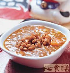 2.在作法1材料中加入匈牙利红椒粉、咖哩粉、低筋面粉拌炒约2分钟,加入昆布柴鱼高汤煮约8分钟,以黑胡椒粗粉、糖、盐调味后盛盘,最后再放纳豆即可。