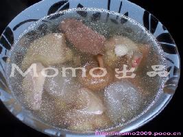 3.将海底椰、响螺肉及瘦肉放入电砂煲中,加入1升清水煲1.5小时。