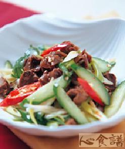 1.螺肉洗净,挤干水分;小黄瓜洗净,去头尾后切片;葱洗净切丝;九层塔叶片洗净备用。