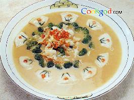 2、将高汤调好口味,放入金瓜泥、鸡油,调制成金汤。