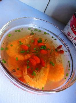 明虾,枸杞,葱段,姜片,盐,鸡精,香麻油