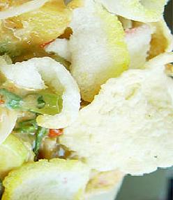 二、将鸡蛋打散,明虾片放进抓一抓(湿菱粉要抓得恰当,抓多了炸不透,抓少了包不住明虾,炸时明虾会与湿菱粉脱离)。