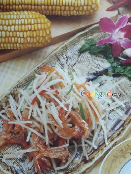 ③锅内注油烧热,下入葱姜丝、红椒丝、豆芽煸炒,加入虾干、香菜段、调料炒匀,淋香油即可。