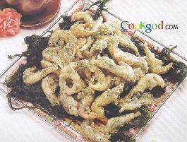 2、锅中加油,加热至六成热时,投入浆好的白虾炸熟时,投入浆好的白虾炸熟,上桌带一碟椒盐粉。