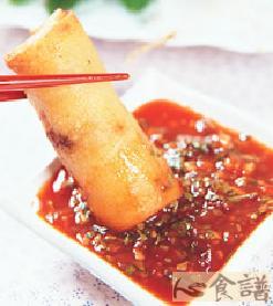 4.由内而外捲成长筒状,并于封口处沾些许调味料B封黏固定。