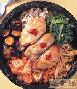 4.在作法3的白饭上面,依序放入韩式泡菜、黄豆芽拌菜、菠菜拌菜、香辣茄子、香拌金针菇,并于中间处放入作法2的生蚝后,最后再加入少许的市售韩式辣酱即可
