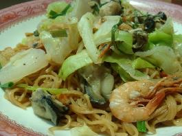 炸面线一包,洋葱半个,樱花虾,虾,蚵仔,蒜末,青葱,米酒少许,酱油少许,黑椒粒少许,盐少许,高汤1杯