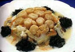 ⑤将上汤煮滚加入干贝用盐调味后,勾成稀芡,浇到碟中,并淋少许鸡油即可。