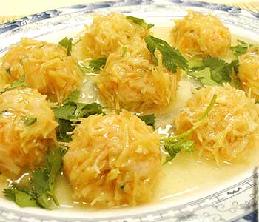 12.锅置旺火上,倒入上汤200毫升,烧开后加少许味精、湿淀粉勾芡成薄芡,淋在绣球上即成。