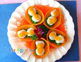 4、蜜豆洗净,切长3厘米的段,入沸水中大火汆2分钟,捞出冲凉,整齐地摆在用芒果制成的碗中,上面放炒好的元贝肉,将调好的芒果味汁浇在元贝肉上,周围用胡萝卜丝、香芹、兰花点缀。