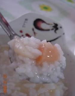 2.待大米粥煮熟了再添一次水,让米粒煮烂一点,让干贝的鲜味充分融合到粥里.