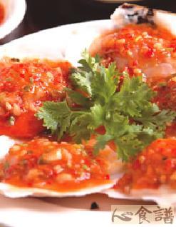 扇贝8片,香菜适量,柠檬叶3片,蒜头3颗,姜少许,鱼露3/2大匙,柠檬汁2大匙,泰国辣椒膏少许