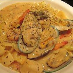 冻青口(贻贝)8只,洗净,冻中型熟虾12只,冻中型扇贝肉8只,大洋葱1个,去衣,切丝,蒜蓉1汤匙,牛油2汤匙,罐头奶油磨菇汤1罐,水半罐或花奶1/3罐,油、盐适量