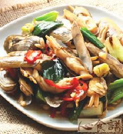 芦笋贝280公克,葱2根,姜10公克,蒜仁10公克,辣椒1根,A.蚝油1大匙,细糖1/4茶匙,料酒1大匙,B.香油1茶匙