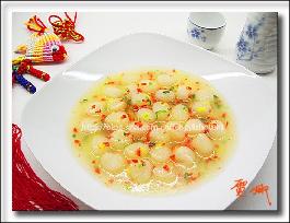 我是为了保持原汁原味用了煮鲜贝的汤勾芡,如果要芡清亮透明就换水,用盐调味后勾芡即可.