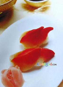 寿司饭300克,新鲜北极贝、寿司姜、芥末酱(辣根)各适量。