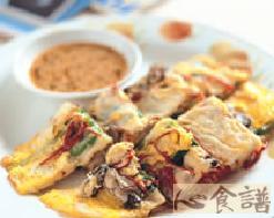 蛋1颗,糯米粉60公克,低筋面粉100公克,牡蛎200公克,蛋1颗,干辣椒丝少许,葱2根,韭菜4根,盐1/2大匙,水1杯,酱油2大匙,醋1大匙,葱末1大匙,炒香白芝麻1大匙,香油1大匙,米酒1大匙,胡椒粉1小匙,芝麻油2大匙