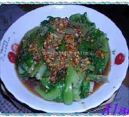 5、生菜装好碟,把爆香的蒜蓉蚝油淋上菜面;