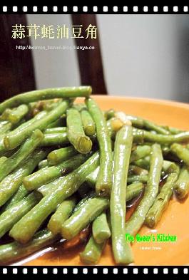 3.蒜爆香油锅,下豆角爆炒片刻后加1茶匙料酒继续翻炒片刻后加入适量的盐、鸡精,和1大茶匙蚝油以及2-3大茶匙水翻炒均匀后加锅盖焖3-5分钟后再翻炒几下即可装盘。