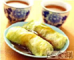 (4)将一片白菜叶铺平,把40公克馅料放在白菜叶上,捲起成3公分的条状(捲法如一般春卷),依序做好12卷,放在小碟子上,用大火蒸10分钟,取出后淋上蚝油芡汁即可。