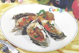 材料活蚝、洋葱末、番茄粒、蒜泥、青葱、百里香、罗勒叶、柠檬汁、苹果粒、平菇、白酒、盐、胡椒