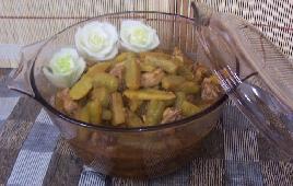 装入大盖玻璃碗中,苦瓜鸡上放三个菜头花做点蕊。