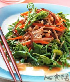 龙鬚菜300公克,金针菇150公克,胡萝卜15公克,黑木耳15公克,蒜末10公克,水1200cc,沙拉油1大匙,蚝油1大匙,盐1小匙,鸡粉1/2小匙,高汤50cc,香油少许