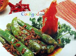 3、锅留底油烧热,下入猪肉末,蒜色,烹入料酒,加蚝油、老抽、味精、白糖烧开,倒入尖椒,勾芡炒匀即可。