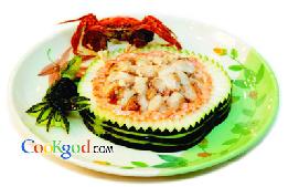5、将提前制好的蟹钳肉放入齿轮冬瓜内,用白米虾肉围上一圈,上笼旺火蒸一分到两分钟即可。