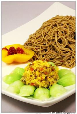 荞麦面二两,菜心四棵,鸡蛋一个,蟹粉两小勺,白醋一小勺,花椒油(热制)一勺,辣豆豉,剁椒,生抽