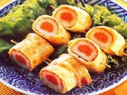 2.蟹肉洗净,放入滚水中氽烫一下,捞起沥干,放在蛋皮上,用手卷起来再切成若干小块,中间插一根牙签固定,即告完成。
