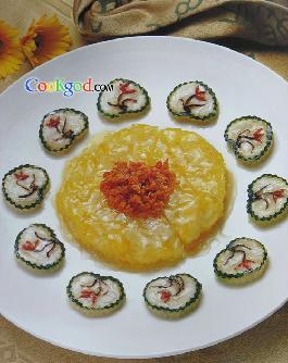3、将鸡油、清汤、调味品、蟹黄同时入味,用淀粉勾芡,淋在鱼肚及冬瓜上即可。