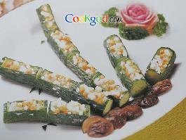 2、将备好的主料装入青瓜节里,摆入盘即可。